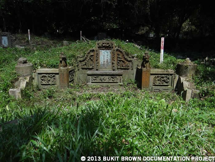 He was buried together with his wife, a sister of Khoo Seok Wan. The names of 2 sons and 2 daughters were inscribed on his tombstone. His daughter Lucy was the daughter-in-law of Chen Tiao Yuan, one time Provisional Governor of Shantung, and his son Bong Him was the son-in-law of Lim Nee Soon. The tomb is part of a family cluster, with his mother buried behind him together with her sister-in-law, while one of his sons is to the side.